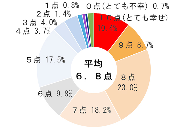 幸福感の程度については、8点と答えた人が23・0%で最も多く、次いで7点(18・2%)、5点(17・5%)の順。10・4%が10点「とても幸せ」と答えた。