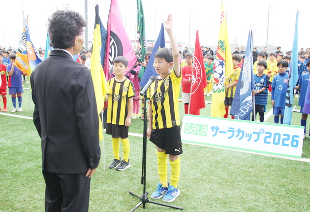 西部キッズU10サーラカップ2026浜松地区予選大会は4日、静岡県浜松市のサーラグリーンフィールドで開会式が開かれ、6月下旬の決勝まで約3カ月間にわたる熱戦の幕が上がった。ヤマハスタジアムで開催される決勝大会の出場2枠を目指し、子どもたちが真剣勝負の戦いを繰り広げる。
