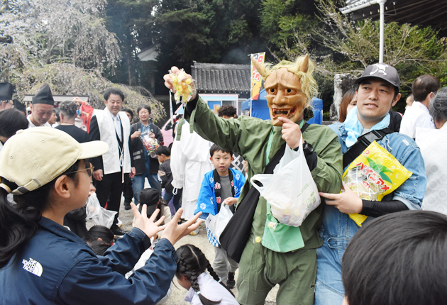 仲間に支えられながらあめ玉を配る青鬼(伊知多神社で)
