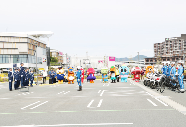 豊川署が主体となり、東三河地区の警察、自治体、交通関係団体の合同で行われ、関係者ら85人が参加し、各自治体等のマスコットキャラクター9体が会場を盛り上げた。