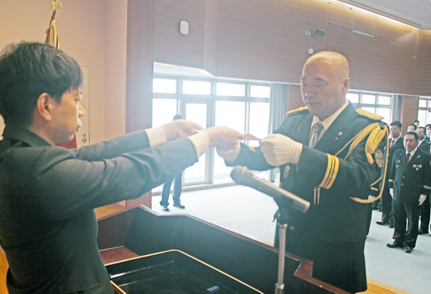 辞令を受けた松本敬一消防団長(豊橋市役所で)