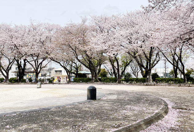 桜が咲く中、噴水が止まった小坂井中央公園(豊川市伊奈町で)
