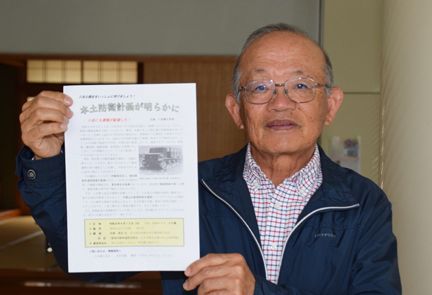 講演会のチラシを見せて来場を呼び掛ける安形会長(新城市の富岡ふるさと会館で)