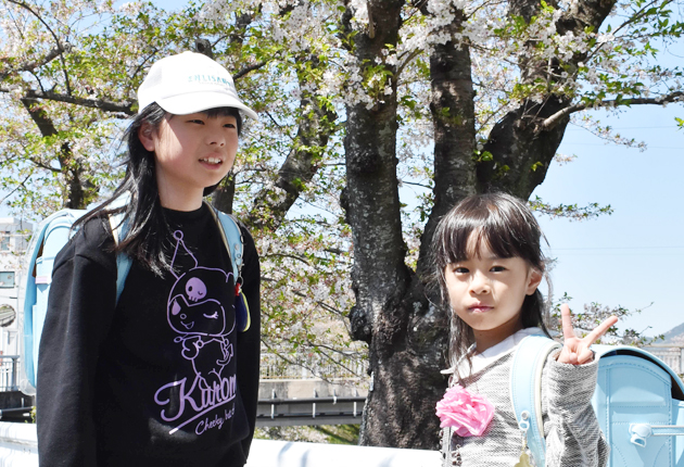 桜を背に、ランドセル姿で姉と記念撮影に応じる女の子(豊川市内で)