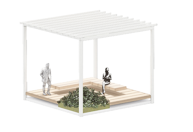 高さ4・2メートル、5メートル四方の「グリッド」を単位とした空間構成を採用。床面の放射熱を抑える段床を敷いたグリッドを100個ほど中庭に設置する。夏は屋根や植栽で日射を遮りつつ風を取り込み、冬は風を遮り暖かい光を採り入れるなど、場所ごとに最適な滞留スペースを配置する。福利施設前と中央広場の2カ所に拠点を設け、雨にぬれずに移動できる連絡通路やスロープを整備。イベント利用も想定し、地域住民も使いやすい開かれた空間を目指す。