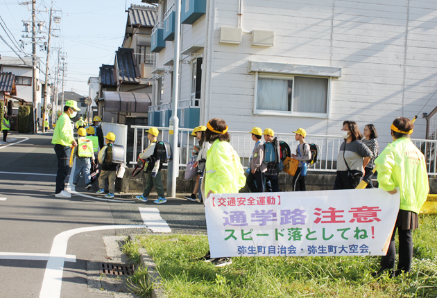弥生町自治会は9日、市立栄小学校の始業式に合わせ、午前7時半から同8時までファミリーマート弥生町店交差点北方向一方通行の道路で通学の見守りを行った。警察官も含め、総勢20人ほどが参加した。
