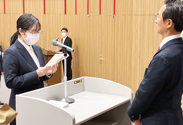 その後、新入生を代表して野﨑陽向(ひなた)さんが「AIがどんなに進化しても、患者さまの心に寄り添う看護は変わらない。看護師を目指し、仲間と支え合い、切磋琢磨して成長します」と誓いの言葉を述べ、新たなスタートを切った。