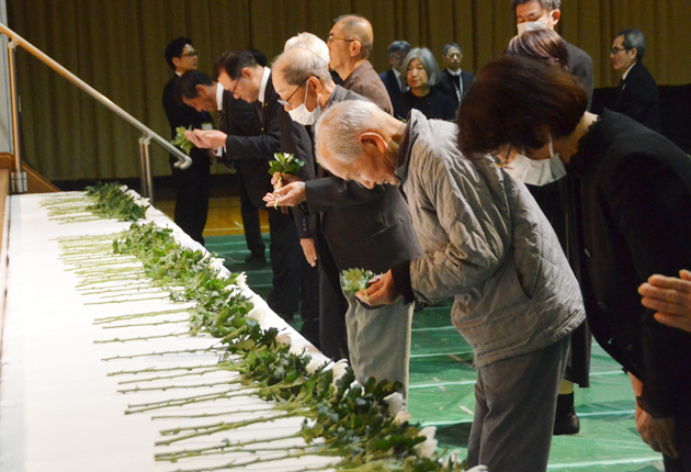 菊の花を供え、手を合わせる参列者(田原市総合体育館で)