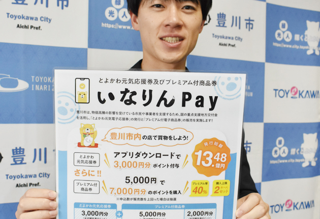 豊川市は、物価高騰の影響を受ける市民や事業者を支援するため、「とよかわ元気電子応援券」の発行と「プレミアム付電子商品券」の販売を行う。いずれも新たに立ち上げたスマートフォン向け専用アプリ「いなりんPay」で申し込める。