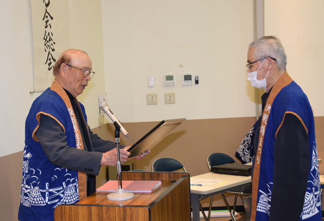 中嶌新会長は、内藤会長の功績をたたえ、感謝状を手渡した。就任あいさつで「会員や地元、市の支援をいただきながら、今年も活動を進めていきたい」と誓った。