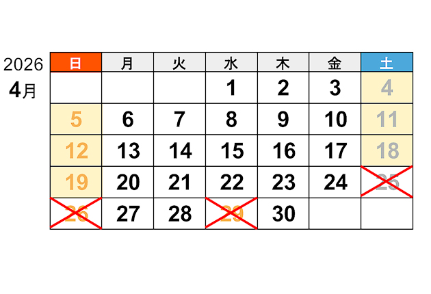 休日割引適用外の日を×で示す4月のカレンダー(高速道路各社発表資料より)