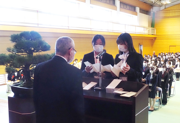 新入生を代表して看護第1科の兒玉凛咲(りさき)さんと看護第2科の新川麻莉子さんが誓いの言葉を述べた。