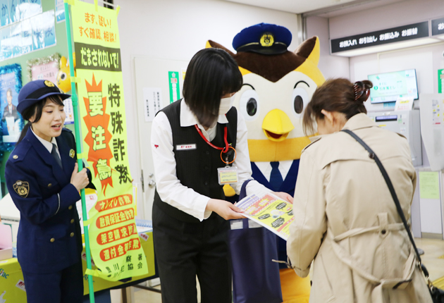 豊川市諏訪1丁目の豊川郵便局は、年金支給日の15日、豊川署と連携した特殊詐欺被害防止啓発活動を実施した。署員や郵便局社員、市人権生活安全課、防犯協会連合会の職員ら約10人と県警マスコット「コノハけいぶ」が出入り口に立ち、来店者に「郵便局を装った詐欺にご用心」と呼びかけるチラシと啓発品を配った。