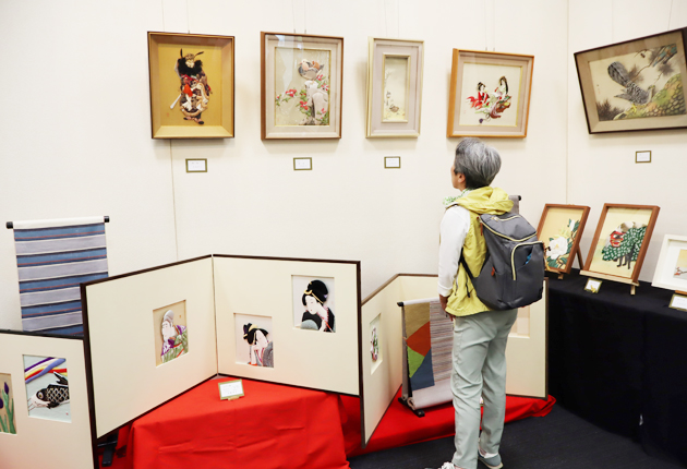 びょうぶや額装などの押し絵作品が並ぶ(豊川市桜ケ丘ミュージアムで)