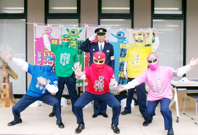 千田署長とシタラレンジャー(東栄町本郷のJA愛知東東栄支店で)=提供=