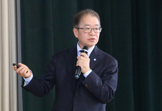 演題は「書く力・話す力を向上させる方法についてーこれからの社会に出ていく若者へ」。