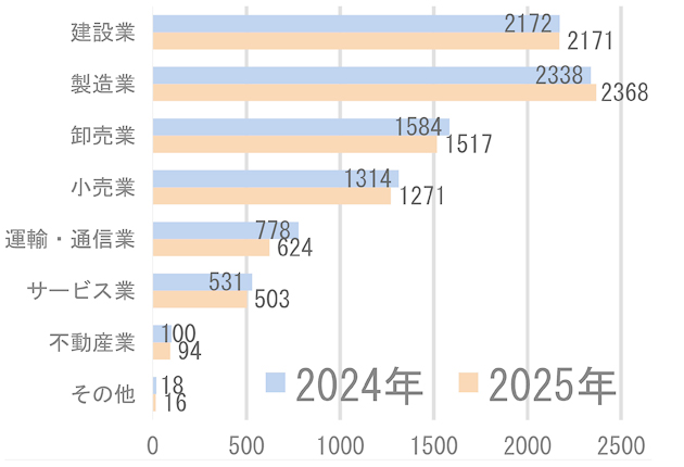 愛知県内の状況を業種別に見ると、「製造業」が2368社で最も多く、次いで「建設業」が2171社で、ともに前年からの高水準が続いている。製造業では円安や原材料価格の高騰に対し、価格転嫁が追いつかない中小企業の苦境が続いている。一方、「運輸・通信業」は、運賃交渉の進展やIT需要の拡大を背景に、高リスク企業が前年の778社から624社へと大きく減少した。
