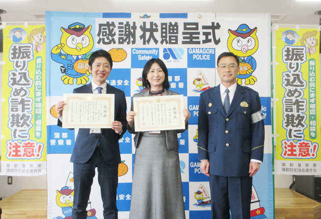 特殊詐欺被害を未然に防いだとして、蒲郡署は17日、蒲郡市元町の三菱UFJ銀行蒲郡支店に感謝状を贈った。