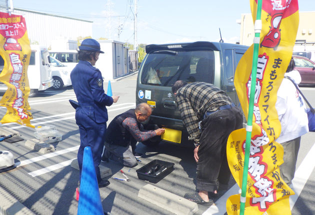 署員らは無料で、希望者の車両ナンバーへ特殊な工具でしか取り外せない盗難防止ネジを設置。自動車盗が多発している現状や、犯罪情勢を記したチラシも配布して注意を呼びかけた。