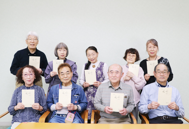 詩誌「風紋」第24号をPRする会員の皆さん(市総合福祉会館あいトピアで)