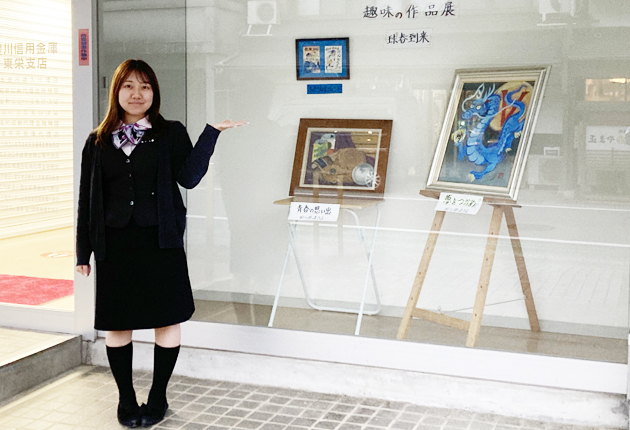 四ツ谷さんの絵画を展示している(豊川信金東栄支店で、同金庫提供)