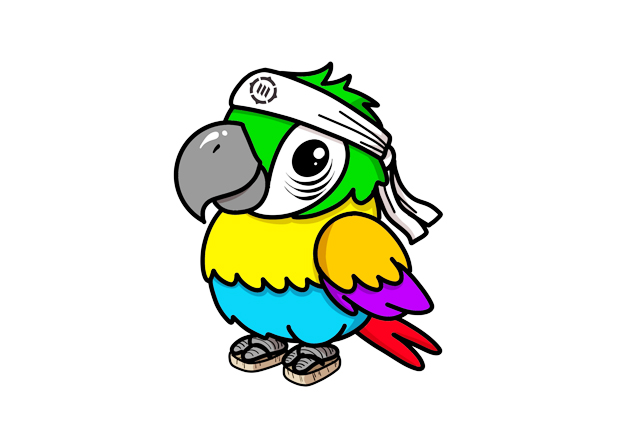 マスコットキャラはコミュニケーションを象徴するオウムを起用し、ロゴマークと同様に7大陸をイメージした色でカラフルに仕立てた。頭には市の市章が入ったハチマキを巻いている。