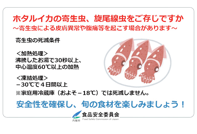 春の味覚・ホタルイカについて、生食すると寄生虫による食中毒のおそれがあるとして、内閣府食品安全委員会が交流サイト(SNS)などで注意を呼びかけている。適切な処理方法で調理するように求めた。 除去方法について、生食用の場合はマイナス30度で...