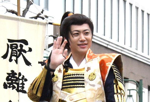 最後尾のてつやさんは、家康が若い頃に着用していた金色の甲冑(かっちゅう)「金陀美具足(きんだみぐそく)」姿にグループのメンバーカラー・だいだい色の陣羽織を羽織って、馬上から沿道の声援に応えた。