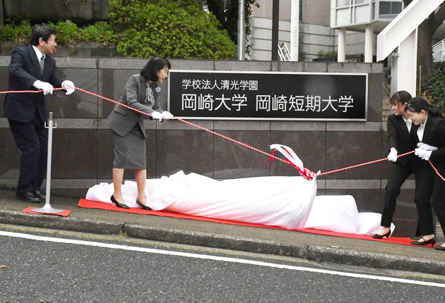 入学式前日の1日には正門看板の除幕式があり、春日学長や学生、両校を運営する学校法人清光学園の林陽子理事長らが参加して、船出を祝った。