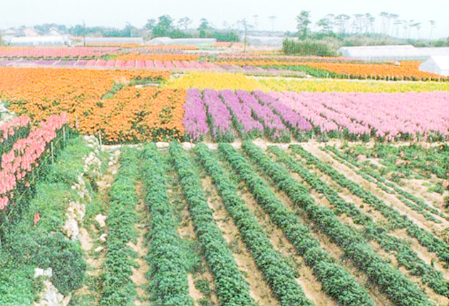手前の緑色はキクの苗、ピンクがキンギョソウ、オレンジがキンセンカ、黄色が菜の花、紫色がストック。奥の方には温室やビニールハウス、若見集落が確認できる。黒松は潮風や台風から作物や屋敷を守る保安林の役割を果たす。
