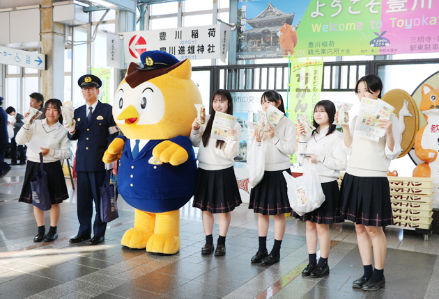 豊川署は20日、JR豊川駅東西自由通路で、春の安全なまちづくり県民運動の重点項目である「子供と女性の犯罪被害防止」に基づき痴漢・盗撮被害防止キャンペーンを実施した。私立豊川高校の生徒36人と教職員、安全なまちづくり推進指導員など計約70人が参加した。