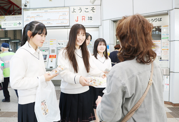 JR豊川駅東西自由通路で豊川高生徒らが被害防止キャンペーン