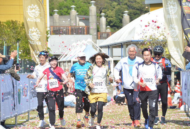 ゴール手前でフラワーシャワーを浴びるリレーの出場者(サンテパルクたはらで)