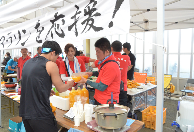 ゴール先のサンテドームでは、大会を応援している田原ロータリークラブの会員が田原産の甘夏をその場で絞ったフレッシュジュース、フルーツ、わかめスープなどを振る舞い、出場者をねぎらった。