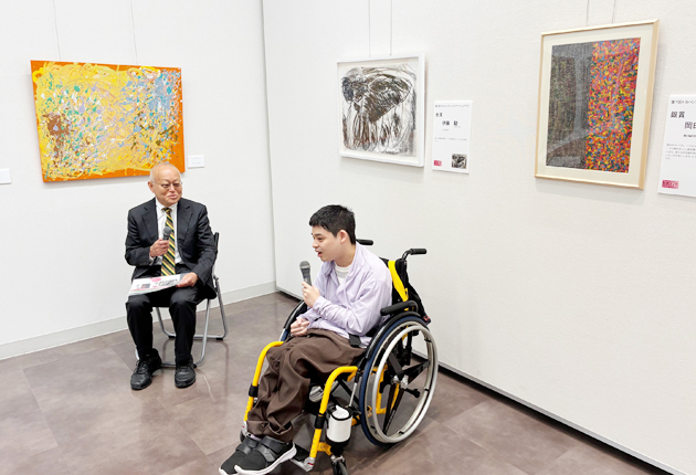 作品の前でインタビューに答える伊藤さん㊨(豊橋市美術博物館で)