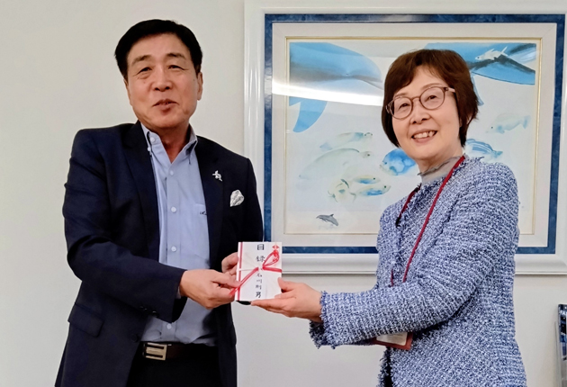 加藤常務に目録を手渡す石川さん㊧(提供)