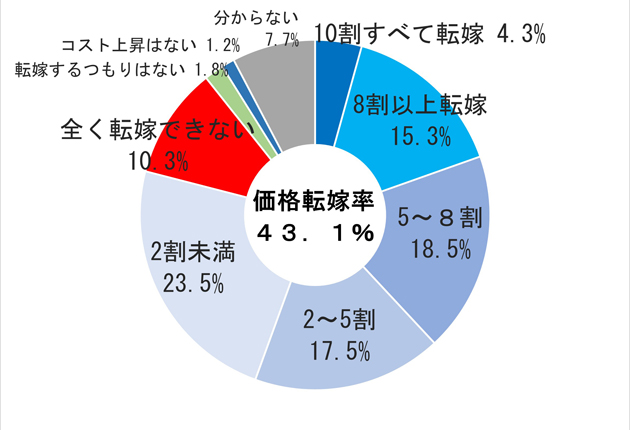コスト上昇分に対し「多少なりとも価格転嫁できている」と回答した企業は79・0%と、前回から4・8ポイント上昇。一方で「全く転嫁できない」とする企業も10・3%存在し、1割を上回る水準で推移している。