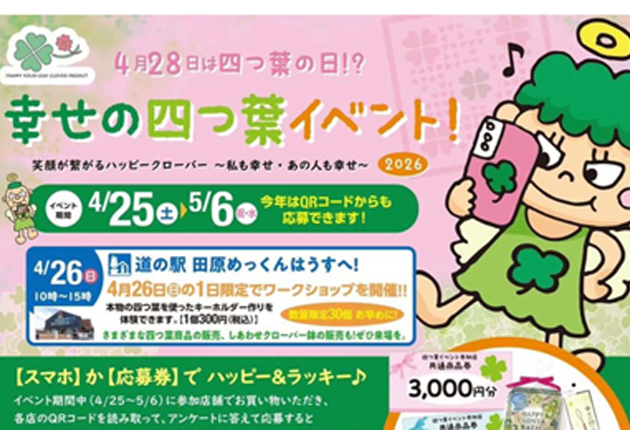 「幸運」などの花言葉を持つ四つ葉のクローバーをモチーフに田原市で展開されている「幸せの四つ葉プロジェクト」として、独自の「四つ葉の日」(4月28日)に合わせた「幸せの四つ葉イベント」が25日から5月6日まで市内の店舗などで行われる。26日...