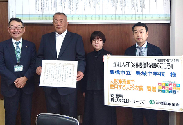 葬祭業の「トワーズ」(静岡県浜松市)は21日、豊橋市立豊城中学校に人形浄瑠璃で使用する人形衣装を贈った。 校内で贈呈式があり、深谷憲博社長は「私もこの中学の卒業生で、良い思い出がたくさんある。貢献できて良かった」と述べ、前田近子校長に目録...