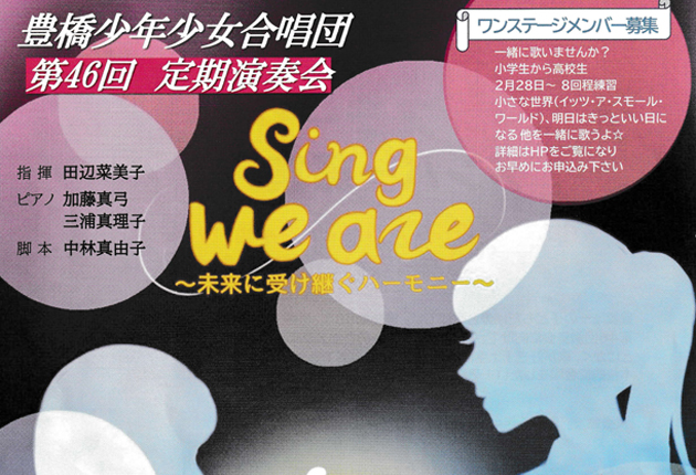 小学生から高校生までの子どもたちでつくる「豊橋少年少女合唱団」の「第46回定期演奏会」が29日、豊橋市神野ふ頭町のライフポートとよはしコンサートホールで開催される。合唱団員とワンステージメンバーが歌声を披露する。 第1ステージでは、「フィ...
