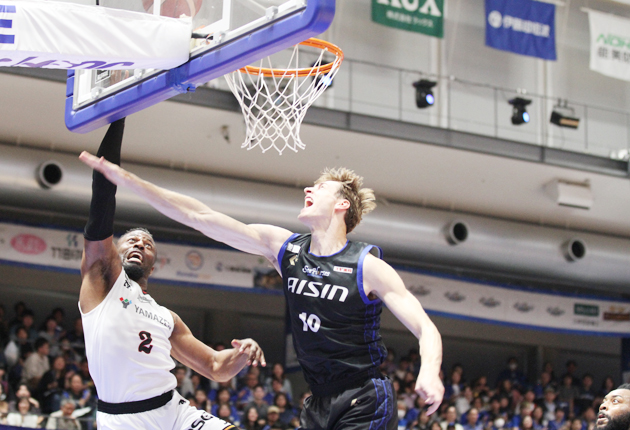三遠は序盤、アウェーとは思えない三遠ブースターの大声援を背に、果敢に攻勢を仕掛けた。デイビッド・ヌワバの3点シュートなど8点差リード。だが、第2Qから守備のミスで失点を重ねて逆転を許し、34―40で前半を折り返した。
