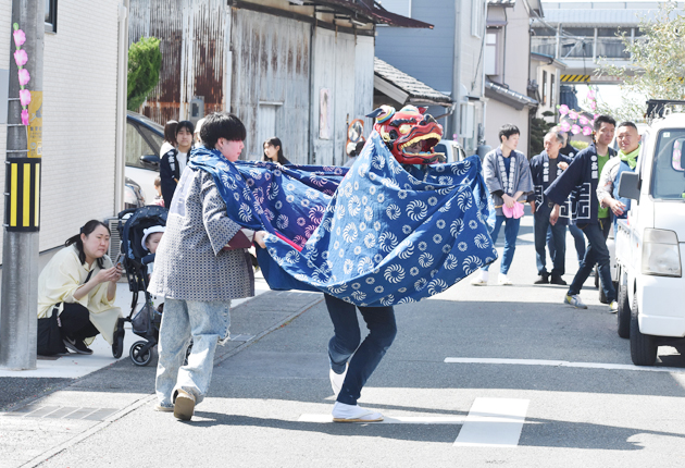 男性が着物をまとって獅子舞となり、笛や囃子(はやし)の音色に乗って伝統の舞いを披露した。東海道新幹線のガード下を皮切りに、赤根地区内を練り歩きながら路地や公園で踊り、神社の境内でも見物人の前で披露した。町民らには獅子舞をかぶるなどの体験も提供した。巫女(みこ)舞いや餅投げもあり、大勢の町民が集まった。