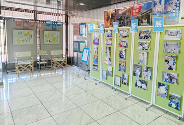 展示されている花島さんの作品や写真(豊川信金提供)