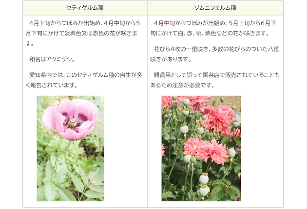 今回問題となったソムニフェルム種のほか、セティゲルム種(アツミゲシ)は、麻薬の原料となる成分を含んでいる。
