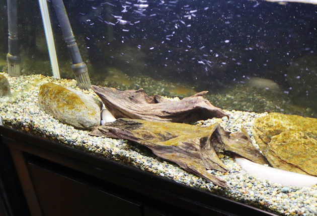 白いウナギの展示は全国の水族館でも珍しく、同館では初めて。隣の水槽には同じくアルビノのウーパールーパー(メキシコサラマンダー)も展示されている。