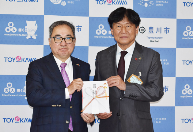 竹本市長に目録を手渡す吉田社長㊧(豊川市役所で)