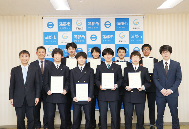 鈴木市長(後列左端)に受賞報告した海陽中等教育学校の生徒ら=蒲郡市役所で(提供)