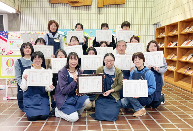 14年連続で贈られた礼状を手にする職員ら=蒲郡市立図書館で(提供)