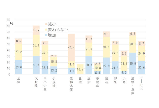 非正社員の採用予定についても45・0%と3年ぶりに増加に転じた。景況感の持ち直しによる「攻めの採用」の動きがある一方で、原材料高騰による人件費抑制を余儀なくされる企業もあり、二極化が進んでいる。