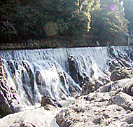 人工水路建設で寒狭川をせき止めた長篠堰堤